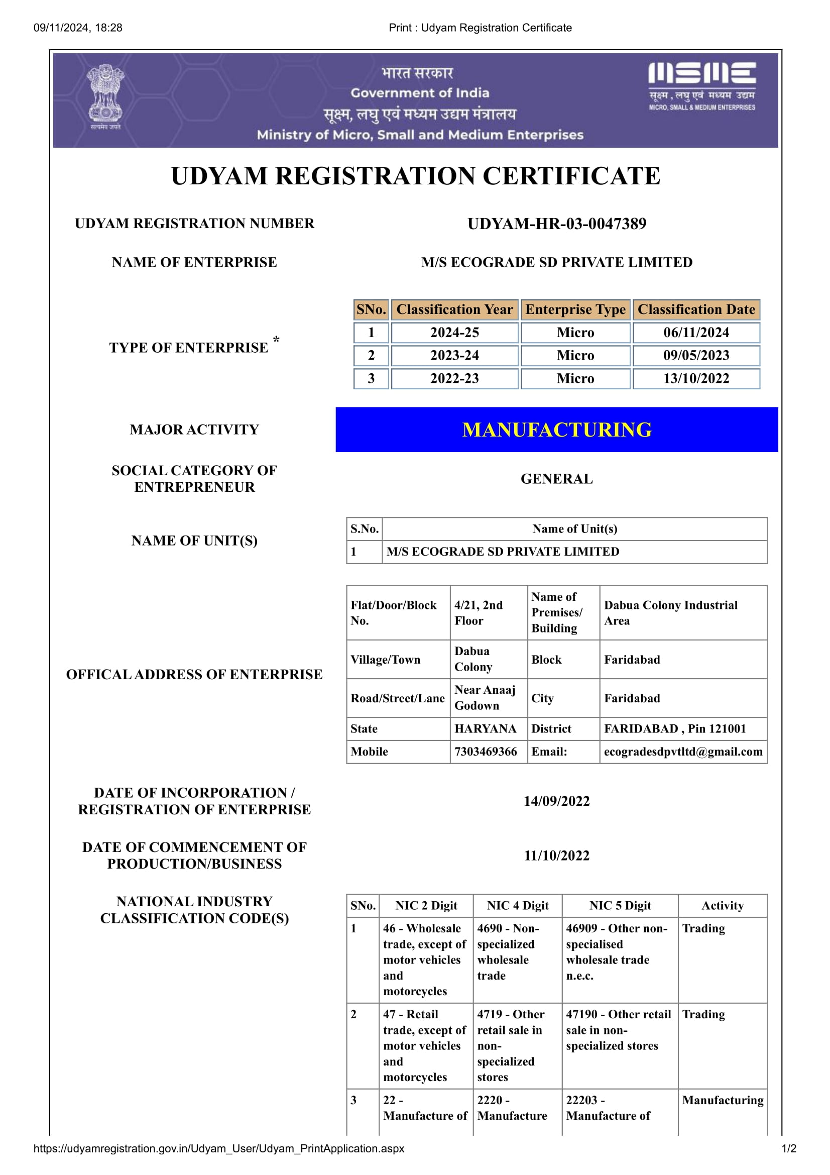 Udyam Registration Certificate